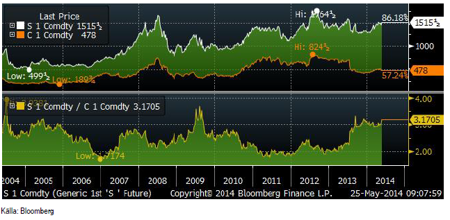 Om vi tittar på kvoten mellan priset på spotkontraktet på sojabönor och majs de senaste tio åren, ser vi även där, att kvoten ligger högt på 3.17 gånger dyrare soja än majs. Medelvärdet verkar ligga på 2.5 med en botten kring 2 gånger.