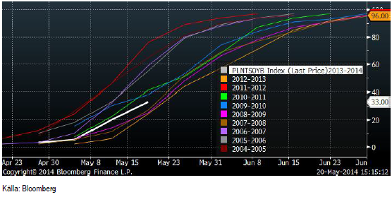 Sådden av sojabönor har kommit till 33% sått, upp procentenheter från förra veckans 20%. Sådden ligger några procent efter en genomsnittlig vårbrukstakt. Vädret var dock varmt och torrt i veckan, så man kan nog vänta sig att hälften av arealen är sådd i måndagens rapport.