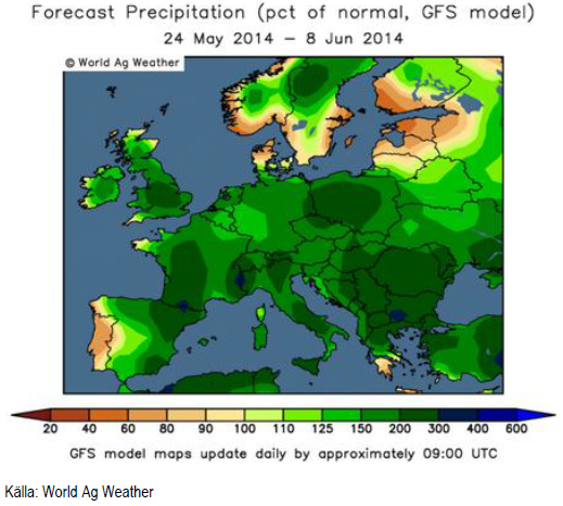 Europa fortsätter att vara mycket blötare än normalt. Det kommer att börja torka upp i södra Sverige och i Danmark. Det kommer att fortsätta regna kraftigt i Nordafrika, och det är inte bra eftersom spannmålskörden strax börjar där.