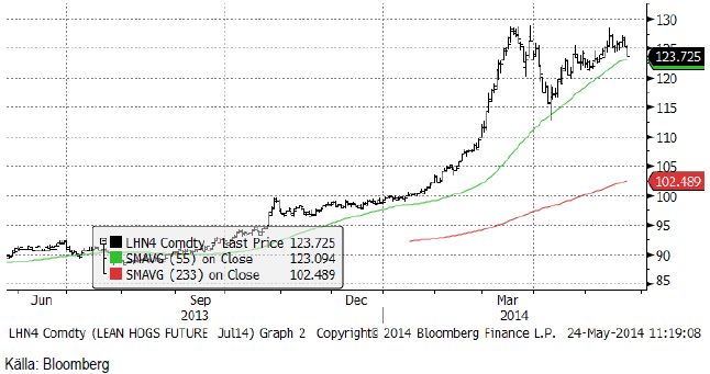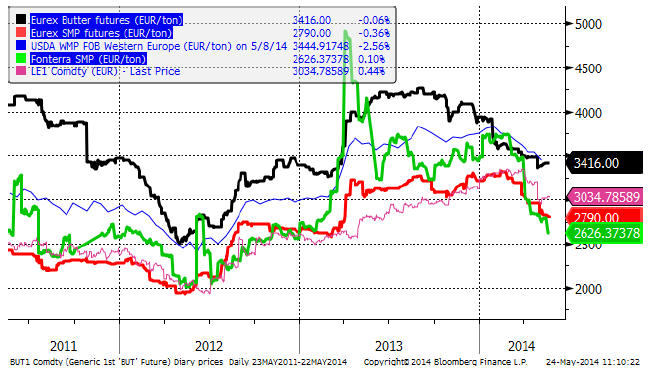 Terminspriserna på EUREX steg även den här veckan, till slut. Genomsnittspriset för de kommande 12 månadernas terminer steg från 3.70 kr till 3.72 kr per kilo. Mitt i veckan var priserna upp till 5 öre lägre än de slutade på. Från att ha varit lägre terminspriser ju längre fram i tiden förfallet ligger för terminerna, har detta vänt den senaste tiden. Terminsmarknaden förväntar sig högre spotpris på SMP och smör under hösten. Om detta faktiskt besannas återstår att se. Det finns i vart fall utrymme för besvikelser nu. Som vanligt vill vi påminna om att SEB ”bättrar” börsens köpkurs med 1% i detta inledningsskede av börshandeln. Det innebär alltså ett snitt pris för de kommande 12 månaderna (inklusive maj 2014), går att sälja på 3.76 kr / Kg basis SMP och smör.