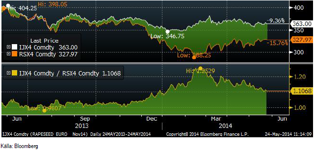 Skillnaden mellan kanadensisk canola i eurotermer och Matifs rapskontrakt (båda för novemberleverans) har sedan förra veckan vidgats lite från 12.5% till 10.7%. Vi behåller positionen med förhoppningen att kunna krama ur ytterligare ett par procent.