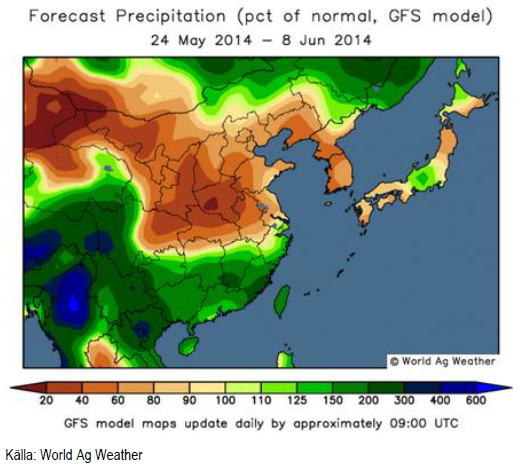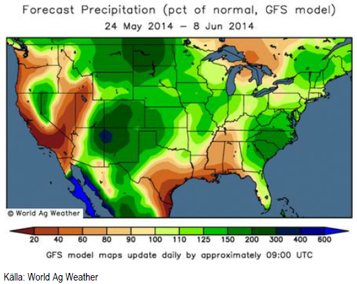 De senaste veckornas trend mot mer nederbörd i de torkdrabbade veteproducerande delstaterna Texas, Oklahoma och Kansas, ser ut att fortsätta. Corn belt ser ut att få en del regn. Odlingsvädret i USA har den senaste tiden inte alls varit så dåligt som mediarapporteringen har återspeglat och som vi ser fortsätter vädret att förbättras. I det här läget, så nära skörd i södra USA, är regn inte nödvändigtvis bra, men prognosen innehåller inte några överdoser av regn.