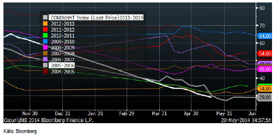 Tidigare i veckan rapporterade Ukrainas lantbruksförening ett estimat för majsskörden i år. De väntar sig 28.5 – 29 mt (exkl Krim). Exklusive Krim var skörden 30.9 mt förra året. Marknaden har tidigare väntat sig att Ukrainas skörd, inklusive Krims, skulle minska till 25 mt i år pga dyr gödsel och brist på kapital. En del har talat om att majsskörden kunde falla till 20 mt. Detta verkar inte besannas, vilket är mycket negativt för majspriset. För en vecka sedan var 90% av majsarealen på 4.6 mA sådd. Förra året såddes 4.8 mA (inklusive Krim). I höstas låg förväntningarna på att Ukraina skulle öka sin majsareal till 5.5 – 5.7 mA. Den oro för Ukrainas produktion av majs som egentligen varit en huvudanledning för vårens prisuppgång, framförallt på vete, men även på majs, ser av allt att döma ut att ha varit helt ogrundad.