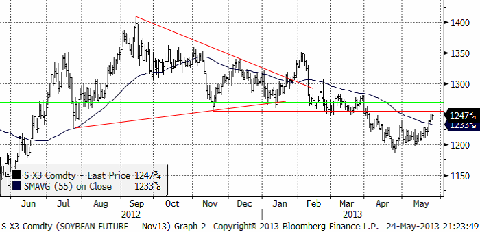 Sojabönorna visade fortsatte att visa oväntad styrka. Priset har stigit upp från 1200 cent upp till 1247 cent när priset ”borde” ha fallit. Vid 1250 finns dock ett starkt tekniskt motstånd, där särskilt många bönder bör ha hängt upp sina säljordrar. Vi tror att uppgången hejdas här.