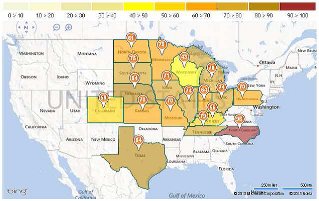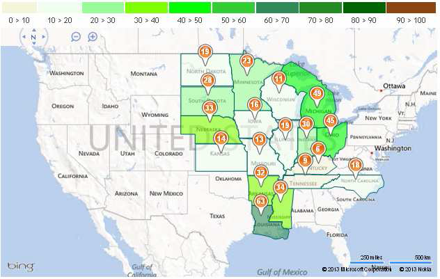 Den mest markanta ökningen i rapporten står den största producenten Iowa för med 71% av sådden avklarad, upp från 15% veckan innan. Även Illinois, den näst största producenten, noterade en rejäl ökning från 17% till 74%.