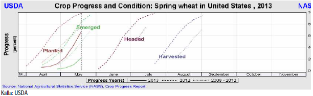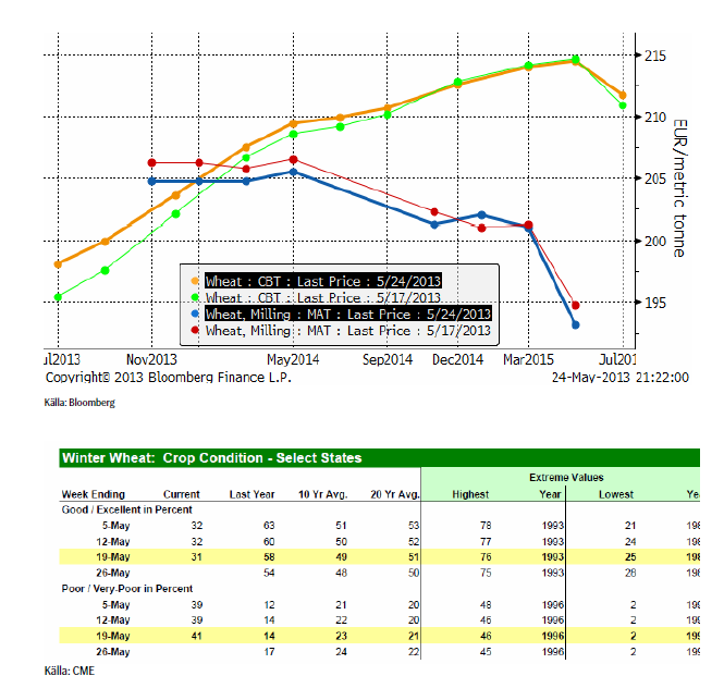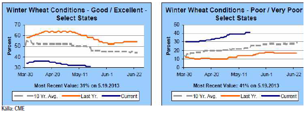 Måndagens Crop Progress rapport från USDA visar att tillståndet för det amerikanska höstvetet fortsätter att försämras. För de 18 stater som rapporterar så klassas 31% som ”good/excellent”, ner 1% från förra veckan och väl under förra årets 58% vid samma tid. Höstvete klassat som ”poor/very poor” uppgår till 41%, en ökning med 2% från förra veckan och väl över förra årets 14% vid samma tid. Andelen höstvete klassat som ”poor/very poor” i de HRW producerande staterna fortsätter att öka, samtidigt som tillståndet för höstvete i de SRW producerande staterna fortsätter att förbättras. Andelen höstvete som har gått i ax fortsätter dock att ligga under genomsnittet, både i de HRW och i de SRW producerande staterna, som en följd av den kalla våren. Per den 19 maj hade 43% gått i ax, vilket är att jämföra med förra årets 80% vid samma tid och det femåriga genomsnittet på 62% vid denna tidpunkt.