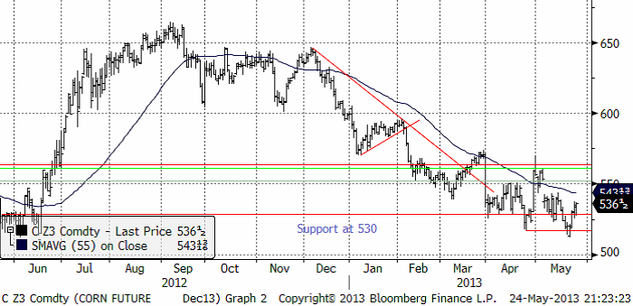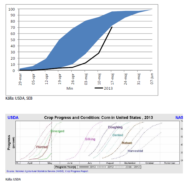 Som nämnt ovan, visade måndagens Crop Progress att lantbrukarna har dragit nytta av det varma och torra vädret och därmed gjort stora framsteg i sin sådda av majs. Per den 19 maj så var sådden i de 18 största majsproducerande staterna avklarad till 71%, en rekordökning med 43% från 28% en vecka tidigare men något lägre än det femåriga genomsnittet på 79% vid den här tiden. Vårens kalla och blöta väder över majsbältet har gjort att årets sådd ligger markant efter förra årets sådd, då 95% var i marken vid den här tiden. Å andra sidan låg förra årets sådd långt före genomsnittet på grund av att våren då var torr och varm vilket till slut ledde till att grödorna drabbades av den värsta torkan på 50 år.