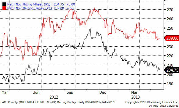 Maltkornet höll sig någorlunda starkt i veckan, men om vetet fortsätter ner, får vi nog se ett nedställ på maltkornet också. Trenden är tydligt nedåtriktad.