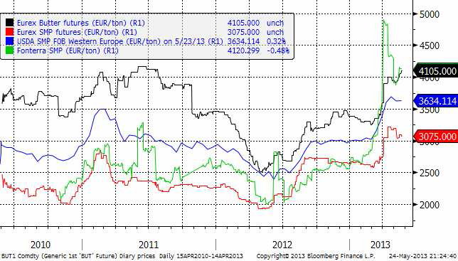 Nya Zeelands mjölkproduktion var 16.8% lägre i mars jämfört med mars förra året enligt industrigruppen Dcanz. Detta orsakades av den torka som drabbat landet. I och med de myckna regnen över Nordön på Nya Zeeland anses den dock vara över nu och därmed är haussen i mjölkpriset över på den internationella marknaden. Priset på Fonterras GlobalDariyTrade har fallit med ca 15% från toppnoteringen. Eurex, som följer den europeiska marknaden för smör och skummjölkspulver ligger dock fortfarande kvar på högre nivå.