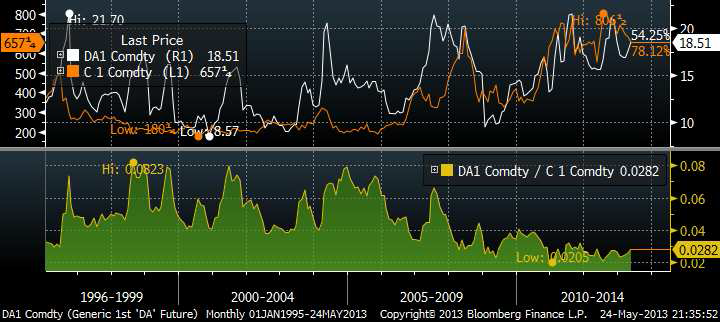 Nedan ser vi kvoten mellan mjölkpriset i USA och majspriset. När ”råvaruboomen” började i början på ”00” – talet försvann lönsamheten från mjölkbranschen. Tecknen hopar sig nu om att toppen på råvaruboomen är över. Det betyder att lönsamheten för mjölkproducenter är över – tillsammans med krisen för grisbönderna. Större trendförändringar inträffar ofta på ett omärkbart sätt, utan att folk inser att en förändring har skett.