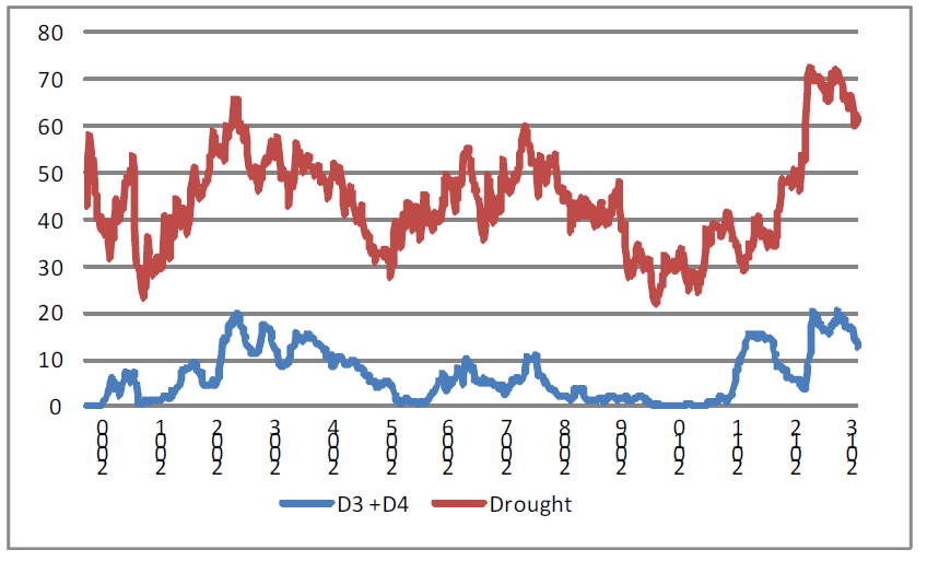 Torkan i USA har fortsatt att minska i USA. Både andelen som är torrare än normalt och framförallt den andel som är drabbad av de värsta formerna av torka har minskat med en procentenhet sedan förra veckan.