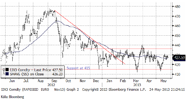 Rapspriset (November 2013) höll sig, som jag skrev förra veckan under 420 euro och rörde sig ”sidledes”. Frågan är om detta är en konsolidering inför en uppgång mot 430 euro eller om priset kommer att vända ner mot 415 euro igen? Det är svårt att säga, men den tekniska bilden indikerar att en nedgång är den mer sannolika rörelsen.