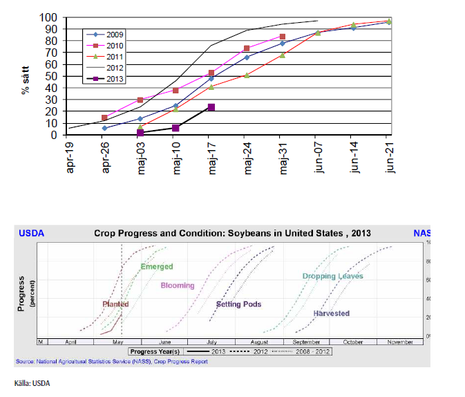 Som nämnt ovan visar måndagens Crop Progress att sådden av sojabönor, som vanligtvis sås senare än majs, fortskrider i sakta mak och nu är avklarad till 24%, vilket kan jämföras med 71% vid den här tiden förra året och det femåriga genomsnittet på 42%.