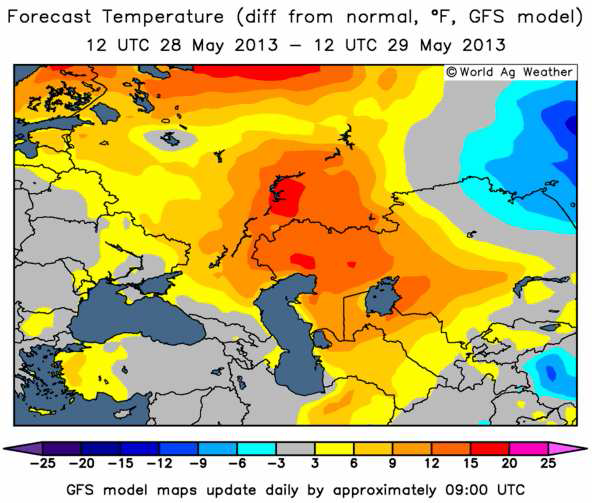 Företaget Black Earth Farming har nyligen rapporterat att odlingsvädret är gynnsamt i deras del av Ryssland, men att det är varmare längre söderut. Nedan ser vi en kartbild över västra Asien av prognostiserad temperaturavvikelse från det normala.