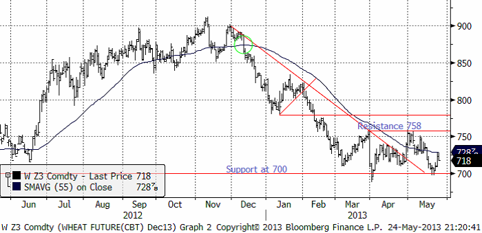 Decemberkontraktet på CBOT rekylerade uppåt. Ibland ser man (magiskt nog) att 55-dagars glidande medelvärde utgör ett stöd eller ett motstånd, t ex vid uppgången i mars. Vi tror att det hände nu också. 700 cent ska testas igen och det tror vi händer den här veckan. Det finns en möjlighet att 700 cent bryts den här veckan.