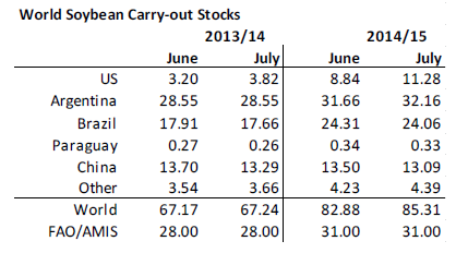 WASDE-rapporten från den 11 juli tog fasta på den högre arealen i USA och justerade upp produktionen med 4.5 mt för 2014/15. Det, och en del högre produktion bland mindre producenter leder till drygt 4.5 mt högre global produktion jämfört med estimatet från juni.