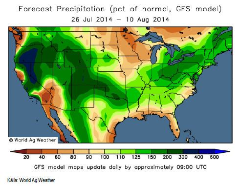 I USA väntas majs- och sojaområdena få normal nederbörd de kommande två veckorna. Längre söderut, där det varit torrt, väntas mer nederbörd än normalt.