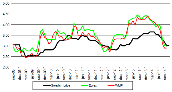 Arla har lämnat priset för november oförändrat från oktober, som jag skrev om förra veckan. I det stora hela har även priserna på EUREX och prisindex för WMP enligt USDA också planat ut. Som vi såg av den förnyade svagheten i SMP, kan det dock vara lite för tidigt att blåsa faran över för ytterligare nedgångar. Arlas notering för mjölkråvara ligger sedan en tid över priset för produkterna smör och SMP, vilket alltså innebär att den kalkylen ger förluster på minst 50 öre per Kg. Produktionskostnaden estimerar jag då till ca 40 öre och priset ligger dessutom under den skillnaden. Detta är naturligtvis inte långsiktigt hållbart och antingen måste EUREX pris gå upp, eller så måste Arla sänka sitt avräkningspris. Den senaste veckans prisnedgång på 7% i SMP, vilket med nästan oförändrat pris på smör innebär en prisnedgång på 4% för mjölkråvara basis smör och SMP, tyder på att det är mer sannolikt att det kommer en prissänkning från Arla i december. Priset på mjölkråvara basis EUREX priser är 2.90 Kr/Kg och Arlas pris är i genomsnitt 40 öre lägre, dock oftast inte när priset är lågt, vilket kompenseras med lägre Arla pris när priset är högt.