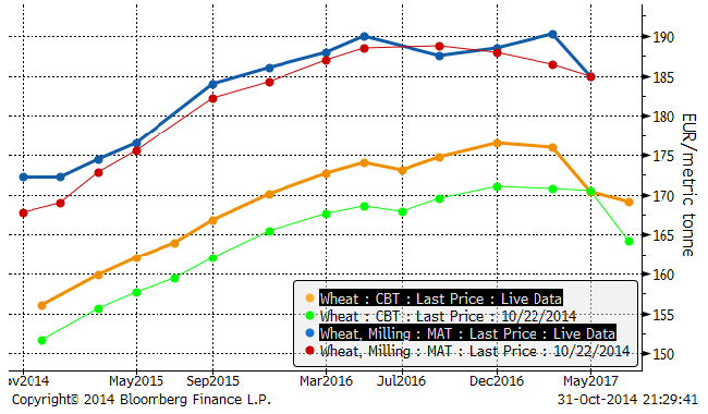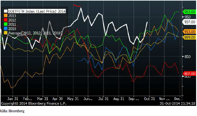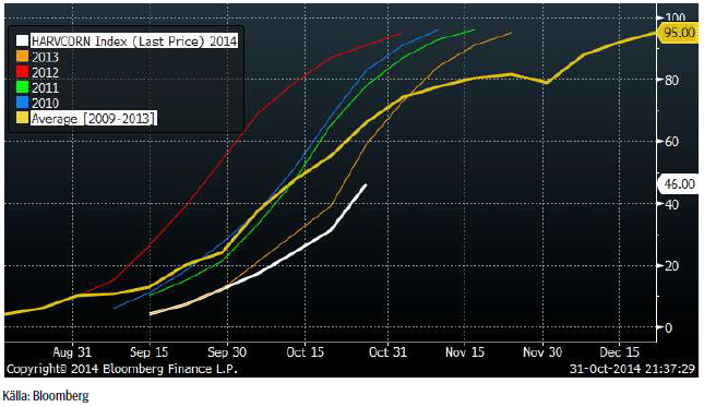 Sojabönorna för leverans i november lämnar vi nu, eftersom de gått in i leveransperioden. Priset har handlats upp våldsamt på dem. Vi tittar nu på januarikontraktet för 2015 (SF5), som inte rusat lika mycket i pris. På 1049 cent per bushel ligger det strax under 1100 som är ett tekniskt motstånd. Det är märkligt att se sojabönor handla så högt, när det efter den senaste WASDE-rapporten egentligen pekade rakt ner för priset. I veckan kom dock den tredje av de tre stora estimerarna i världen (USDA, FAO/AMIS och IGC) med sin rapport: IGC sänkte estimatet för global produktion av sojabönor med 1% till 307 mt. Det är den första rapporten som faktiskt sänker estimatet för global skörd. IGC sänker skörden i Brasilien med 3 mt till 91 mt, därför att det varit lite för torrt i samband med sådden, framförallt i delstaten Mato Grosso. IGC sade att en del fält måste sås om, eftersom torkan gjort att sådden inte slagit rot.