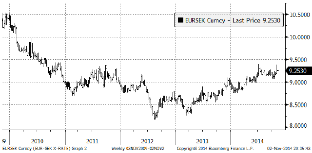 Riksbanken sänkte sin styrränta till noll i veckan som gick. Om man jämför, hade detta en liten effekt på den svenska kronans växelkurs. Det har varit en hel del valutarörelser den senaste tiden och de verkar höra ihop med effektiviteten i ekonomierna som valutorna representerar och förtroendet för den politiska ledningens förmåga att bedriva tillväxtfrämjande ekonomisk politik. Den svenska kronan har sedan marknaden stängde fredagen den 12 september, gått från 9.23 kronor per Euro till 9.38 som dyrast för en Euro, i tisdags. Senare under veckan föll växelkursen tillbaka och stängde på 9.26. Dollarn är väldigt stark mot kronan och har gått från 7.12 till 7.40 sedan den 12 september. Dollarn har varit stark mot de flesta valutor. Tillväxten är stark i USA.