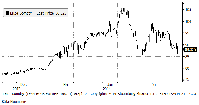 Lean hogs decemberkontrakt tog ett kliv nedåt från den konsolideringsfas som priset var inne i strax under 90 cent. Prisfallet dämpades och hejdades temporärt av köpintressen strax över 85 cent. Trenden är dock nedåtriktad och det är troligt att det kommer ett nytt test nedåt.
