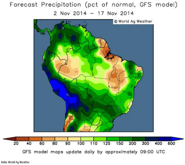 Brasilien ser nu riktigt blött ut i den senaste tvåveckorprognosen. Alla viktiga odlingsområden för soja, majs, vete, kaffe och socker väntas få upp 150 – 300% av normal nederbörd.