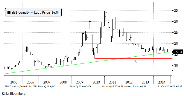 Den senaste veckan har priset på socker gått ner från 16.60 till 16.04. Det låga priset skapar problem för odlarna. Det torra vädret och lägre incitament att sköta odlingen av sockerrör optimalt bör få en påverkan på produktionsvolymen på lite längre sikt. I år ligger ’cane crush’ 8.5% lägre än förra året.