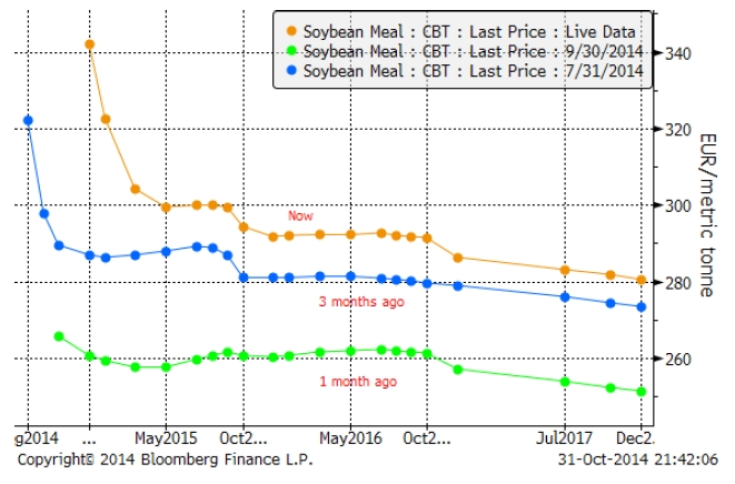 I diagrammet nedan ser vi vad som hänt. Det är tre terminskurvor. Den brandgula visar terminskurvan nu. Vi ser att marknaden räknar med att bristsituationen är avhjälpt i maj. Då planar priset ut på ca 300 euro per ton. Terminskurvan har samma form som den hade för tre månader sedan. Då var det extrem brist på sojamjöl, men vi ser att marknaden förväntade sig att den nya skörden skulle bota detta problem. För en månad sedan tänkte marknaden att skörden skulle råda bot på bristsituationen. Det fanns inte heller någon brist. Decemberkontraktet handlades då i motsvarande 260 euro per ton, väsentligt lägre än 290 euro per ton för tre månader sedan. Den senaste månaden har det alltså återigen blivit brist på sojamjöl och priset är över 340 euro per ton om man vill ha leverans i december.