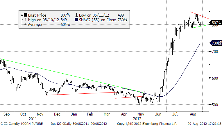 Majspriset har inte riktigt lyckats hitta nya toppnivåer och det är ett svaghetstecken. Marknaden ligger inom en triangelformation. Ett brott nedåt ur den vore inte bra och skulle innebära att vi skulle reducera långa positioner kraftigt och kanske till och med gå kort.