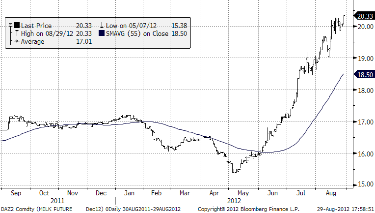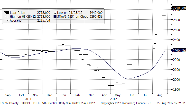 Priset på mjölkpulver i Nordeuropa har fortsatt att stiga ännu en vecka. Nedanför ser vi oktoberkontraktet. Det har fortsatt att öka till 2718, från 2625 euro per ton.