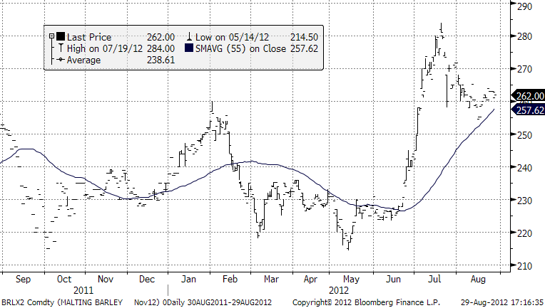 Det har varit stora prisuppgångar på spannmål i sommar. Det finns tecken på att majspriset faktiskt börjar ransonera efterfrågan på majs. Såväl vete som sojabönor ser fortfarande starka ut.
