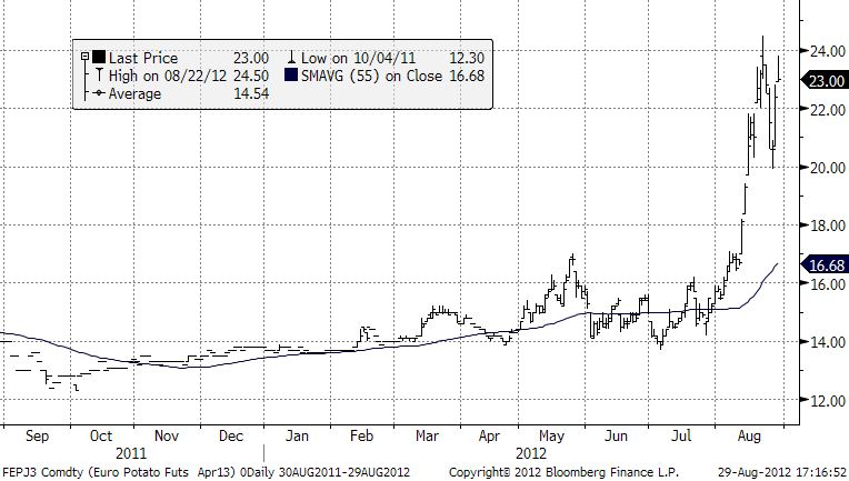 Potatishaussen fick priset att fortsätta stiga efter förra veckobrevet. Efter att ha nått över 24 euro per deciton, föll priset hastigt tillbaka till 20 euro, men har de senaste två dagarna åter stigit och ligger nu på 23 euro. Vi vet att det fanns säljare på över 24 euro, så det återstår att se om de är starka nog.