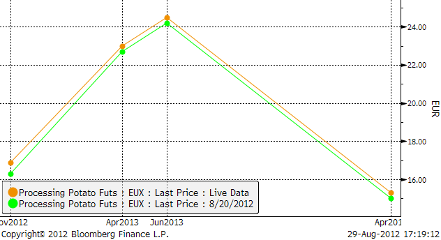 Nedan ser vi terminskurvan för industripotatis på Eurex. Priset för nästa års skörd ligger på 15 euro per deciton. Det är det man ska räkna med att få betalt för nästa års skörd.