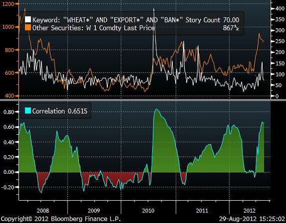 Det är naturligtvis svårt för oss på SEB att följa vad som sägs i hela världen om exportstopp i alla länder. Ett enkelt sätt är att räkna alla artiklar som innehåller nyckelorden Wheat+Export+Ban och det ser vi nedan. Den senaste veckan har det talats mindre om exportstopp. Kanske marknaden är trött på ”storyn”.