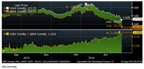När man ser nyheterna att regnen nu vid skörd har ökat utbudet av fodervete och minskat utbudet av kvarnvetekvalitet, kanske man förväntar sig att se att prisskillnaden mellan dessa två kvaliteter ökat plötsligt. Förvånande nog är det inte så. Kvarnvete handlas som bekant på Matif och fodervete på Liffe i London. Kvarnvetet har leveranspunkt i Rouen i Frankrike och fodervetet på en rad olika ställen i Storbritannien. Det intressanta är att skillnaden i terminspris för leverans i november ökat successivt hela året. Vid årsskiftet var skillnaden ca 4%, i mars ca 7%, i juni nästan 10% och nu i juli/augusti 12.3%. Ökningen i prisskillnad pga juli månads regn över Frankrike och Tyskland har alltså bara ökat skillnaden med 2%.