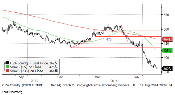 Majspriset, som hållit sig stabilt några dagar, föll och bröt igenom sin tekniska stödnivå i fredags. Bakgrunden är att det kom olika nyhetsrapporter från olika delar av Corn Belt i USA, som visade exempel på exceptionellt hög avkastning. Prisrörelsen indikerar att fortsatt prisfall kan vara att vänta. 350 cent bör dock vara ett gott nästa stöd och det är inte långt dit.