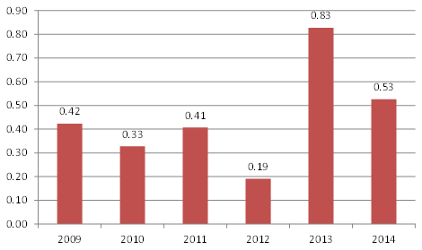 Givet att terminsmarknaden gör rätt prognos för framtida spotpriser, ser vi att terminsmarknaden förutspår ett genomsnittligt pris under första halvåret 2015 på 3.63 Kr / Kg. Drar vi av marginalen till mejeribranschens avräkningspris på 53 öre, är vi nere på 3.10 Kr / Kg för det.