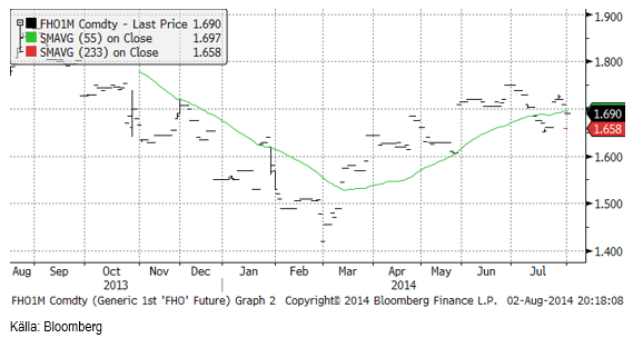 Arlas pris, som exempel för mejeribranschens inköpspris ligger samtidigt på 3.30 Kr / Kg, en spread på 40 öre till augustis terminspris och 60 öre till spotmarknaden. Spreaden till spotmarknaden har varierat mellan åren, men i genomsnitt för sedan 2009 legat på 45 öre. Hittills i år och under 2013 var den större och då inbegriper genomsnittet även dessa år (34 öre var genomsnittet före dessa år).