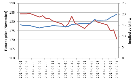Vi har uppmärksammat något udda på vetemarknaden och som kan ha bäring på vad vi ska tro om framtida prisutveckling. Samtidigt som priset på novemberterminen faller, ökar efterfrågan på optioner så att dessa har blivit märkbart dyrare under juli månad. Vi ser en bild på detta nedan (blå kurva är handlad volatilitet i optionsmarknaden och röd kurva är terminspriset på vete).