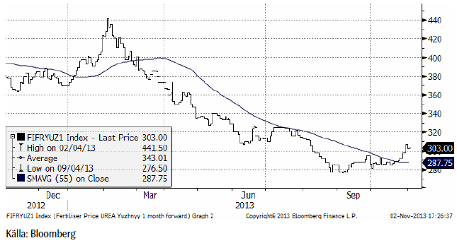 Priset på kväve / urea steg i veckan som gick och ligger nu på 303 dollar per ton. Botten noterades den 4 september på 276.50 dollar per ton. Priset ligger ändå en bra bid under förra årets toppnotering på 441.50.