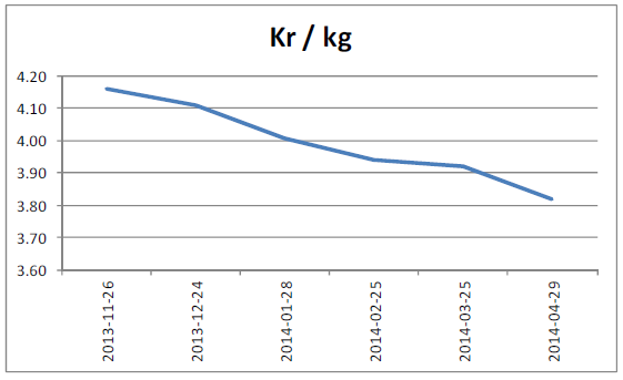 Om vi utgår från terminspriserna på smör och SMP och aktuell växelkurs eursek, får vi följande terminskurva i kronor per kilo svensk mjölkråvara. Notera dock att dessa priser alltid bör ligga över ett pris för råvaran i Sverige (och på andra ställen också) eftersom SMP och smör är produkter och inte råvaror.