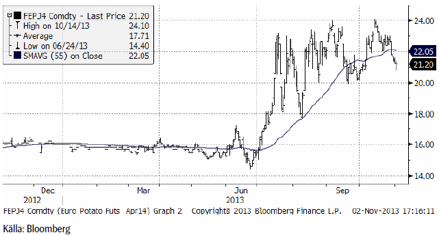 Rapspriset (februari 2014) gick inte under det tekniska stödet på 360 euro i början av oktober och har sedan dess stigit på ett sätt som inte riktigt kan förväntas av en marknad som ska vara i fallande trend. Priset ligger nu strax under 380 euro. Om priset går över 380 euro förändras bilden ytterligare. Det kan vara en trendvändning uppåt på gång. Det återstår att se.