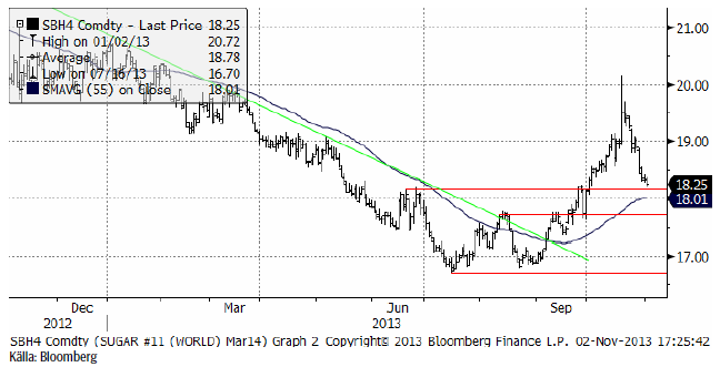 Marskontraktet på råsocker har rekylerat tillbaka till en teknisk stödnivå. Det är en nivå där en vändning uppåt skulle kunna ske. Vi upprepar därför vår köprekommendation på socker.