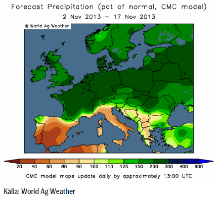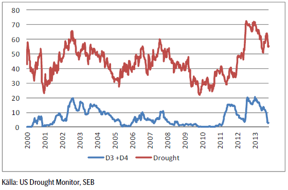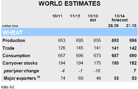 IGC (International Grains Council) kom med sin rapport i förra veckan och har ökat sitt estimat för den globala spannmålsproduktionen 2013/14 med 10 mt till 1940 mt. Tack vare gynnsamma väderförhållanden hos de stora producenterna, framförallt i USA och OSS, så bidrar detta till en förväntad ökning med 8% på årsbasis från 2012 års produktion då torka drabbade stor del av grödorna. Utgående lager justeras upp sedan förra månaden med 7 mt till ett fyra-års-högsta på 367 mt.