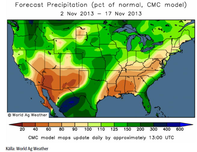Väderprognoser för USA indikerar gynnsamt väder för sådden och utvecklingen av det amerikanska höstvetet. Det finns en del analytiker som redan nu säger att höstvetet kommer att vara i det bästa tillståndet sedan 2010 när det går in i vintervila.
