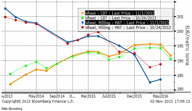 Vi har nu gått över till att studera 2014 års terminskontrakt för vete och maltkorn. Prisutvecklingen på dessa kontrakt ser vi nedan. Notera hur kraftigt terminskontraktet på maltkorn har återhämtat sig i oktober! Priset har gått upp från 190 euro per ton till 226.75 euro. Som vi sagt tidigare ser det ut att kunna bli lönsamt att odla maltkorn nästa år. Den som tycker att det är ett vågspel kan alltid prissäkra till 226.75 euro.