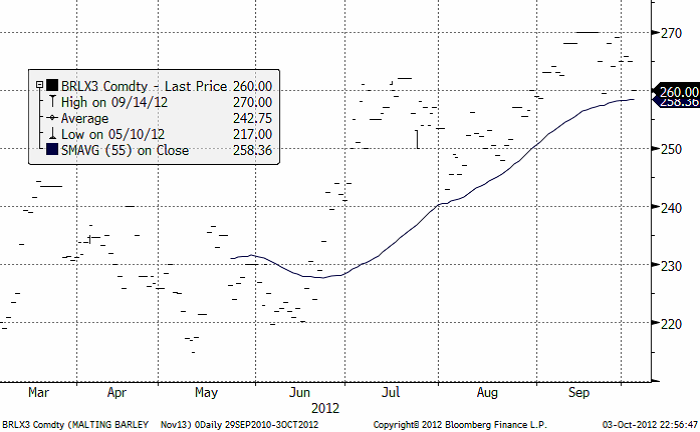Nedan ser vi priset för maltkornterminen med leverans i november 2013. Vi skrev om det märkliga – att dessa priser ligger högre än 2012 års, när vetepriset ligger lägre för 2013 än för 2012. 260 euro per ton för maltkorn måste väl rimligen vara ett bra pris att låsa in?