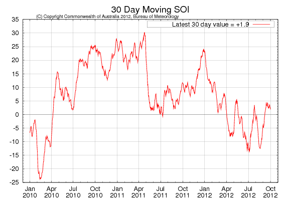 El Niño-signalerna har försvagats så mycket den senaste tiden, att väderförhållandena påminner allt mer om La Niña. Nedan ser vi Southern Oscillation Index (”SOI”), som stigit från El Niño-nivåer till neutral nivå.