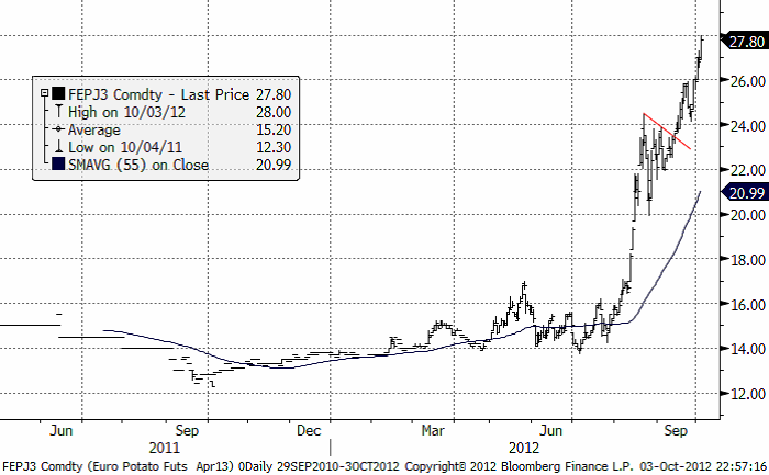 Som vi skrev förra veckan, brukar ett brott uppåt ur en konsolideringsfas som den vi såg mellan 20 och 24 euro leda till ytterligare uppgång. En tumregel är att prisuppgången bli lika lång som uppgången mellan 16 och 22 (mitt i konsolideringsområdet). Potatispriset har nu alltså nästan nått till sitt tekniska prisobjektiv, 28 euro. Den som legat köpt terminer på potatis bör alltså fundera på att ta hem vinsterna – och den som legat köpt den här sortens potatis bör kanske överväga att sälja den.