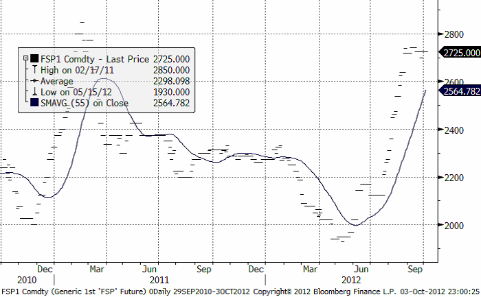 Vi skrev förra veckan om den tekniska säljsignalen som utlöstes när priset gick under bottennoteringen från början på augusti. Nu är dock priset nere på den nivå där marknaden uppehöll sig länge under maj och juni, vid 460 euro. Vi tror på ”sidledes” rörelse nu och att prisfallet alltså tar en paus.